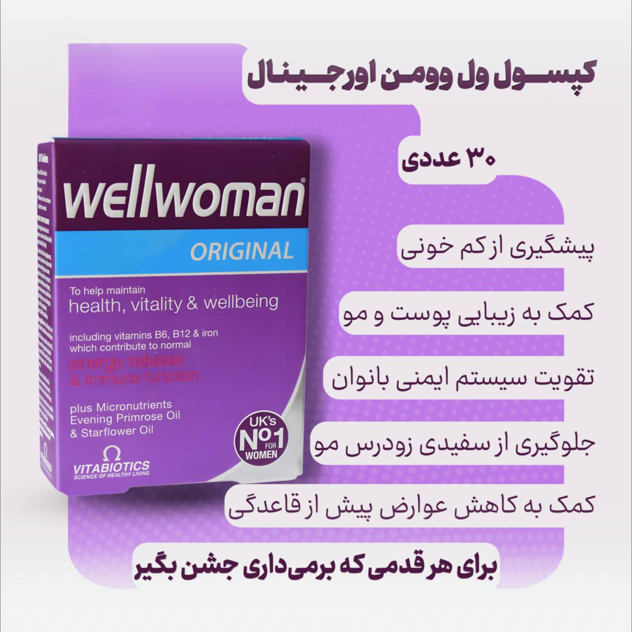 قرص ول وومن اوریجینال، مولتیویتامین تخصصی بانوان دارای طیف وسیعی از ویتامینها و مواد معدنی کمک به افزایش سطح انرژی با تامین گروه ویتامین B کمک به کاهش علائم دوران قاعدگی با داشتن روغن گل مغربی و گل ستارهای کمک به سلامت پوست، مو و ناخن به واسطه دارا بودن زینک، آهن، سلنیوم حاوی ترکیبات آنتیاکسیدانی مانند بیو فلاونوئیدهای مرکبات و بتاکاروتن قابل استفاده در مبتلایان به اختلالات تیروئید (فاقد ماده معدنی ید) هر جعبه از مکمل ول وومن، حاوی دارای 30 عدد قرص و مناسب استفاده 15 روز است. بهترین زمان مصرف ول وومن اوریجینال، بعد از وعده غذایی (ناهار یا صبحانه) و با معده پر میباشد.